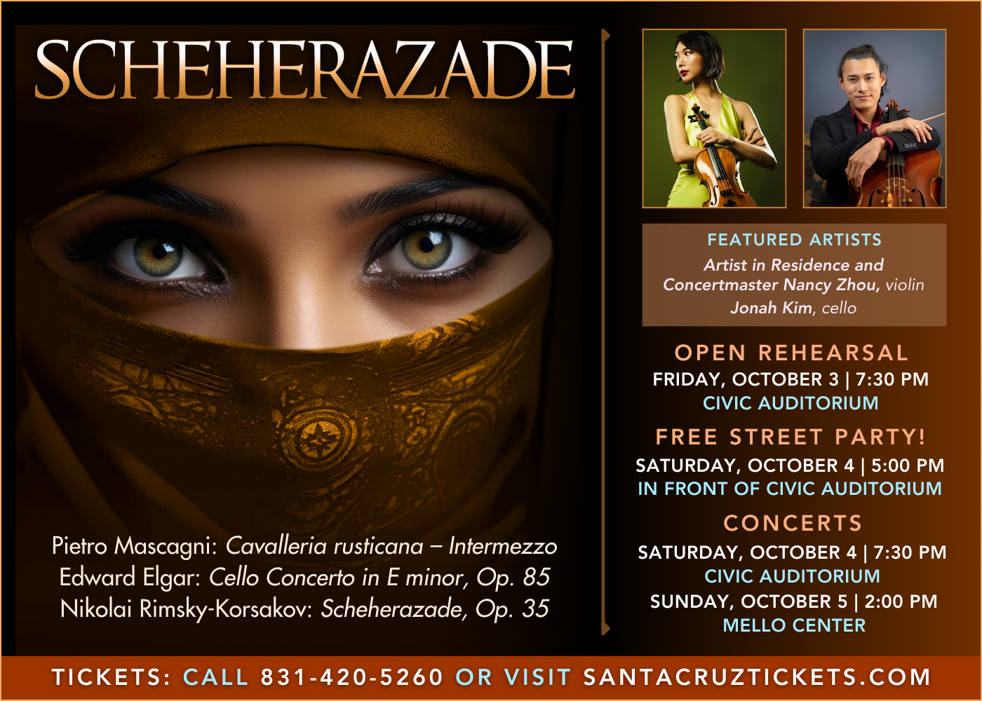 Expect dazzling performances by our featured artists, Artist in Residence and Concertmaster Nancy Zhou and Principal Cellist Jonah Kim. Nancy will represent the voice of Scheherazade with her violin in a work the composer described as a narrative of "fairy tale wonders." Jonah's expressive playing will bring to life the haunting themes of Elgar's contemplative, elegaic Cello Concerto. And the Symphony will thrill you with Mascagni's Cavalleria rusticana, one of the most captivating and recognizable works of all time. This memorable cultural adventure will launch a concert season that promises to expand our horizons while rediscovering timeless classics. We can't wait to explore with you!